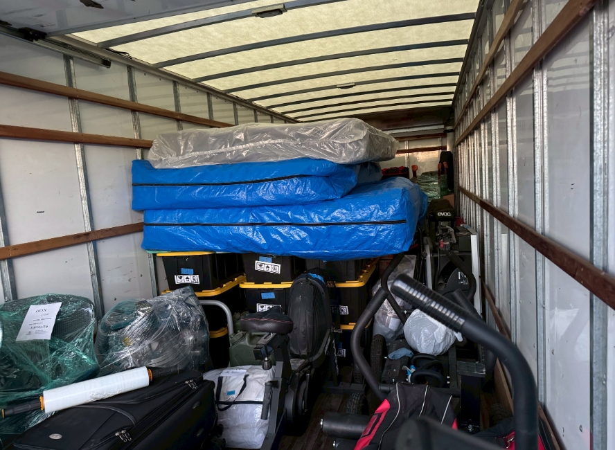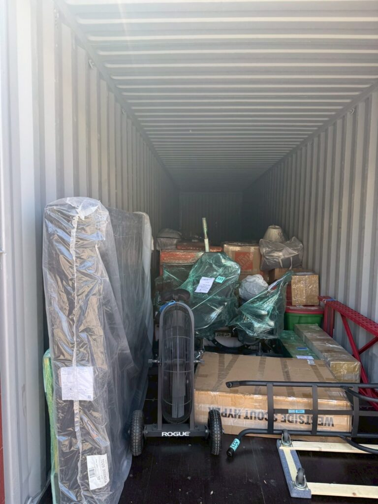 當貨櫃門打開的瞬間,夫妻倆很高興,——看到裡面的家具、健身器材、紙箱,全都安然無恙。